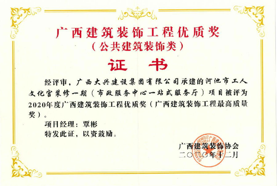 喜訊:大興建設集團喜獲2020年度廣西建筑裝飾工程優(yōu)質獎(廣西建筑裝飾工程最高質量獎)